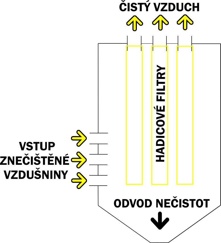 Hadicové filtry jsou vyráběny v průměrech od 140 až 250 mm v délkách až 10 metrů. Uspořádání filtračního materiálu uvnitř mechanického odlučovacího zařízení je nejčastěji vertikálně. V praxi je možné se setkat i s nepříliš populárním horizontálním uspořádáním. Nevýhoda horizontální instalace hadicových filtrů je při regeneračnímu procesu, kdy setřesený prach z vrchního filtračního materiálu částečně ulpívá na níže umístěném filtračním materiálu. Schéma hadicového filtru je k dispozice na obrázku níže.