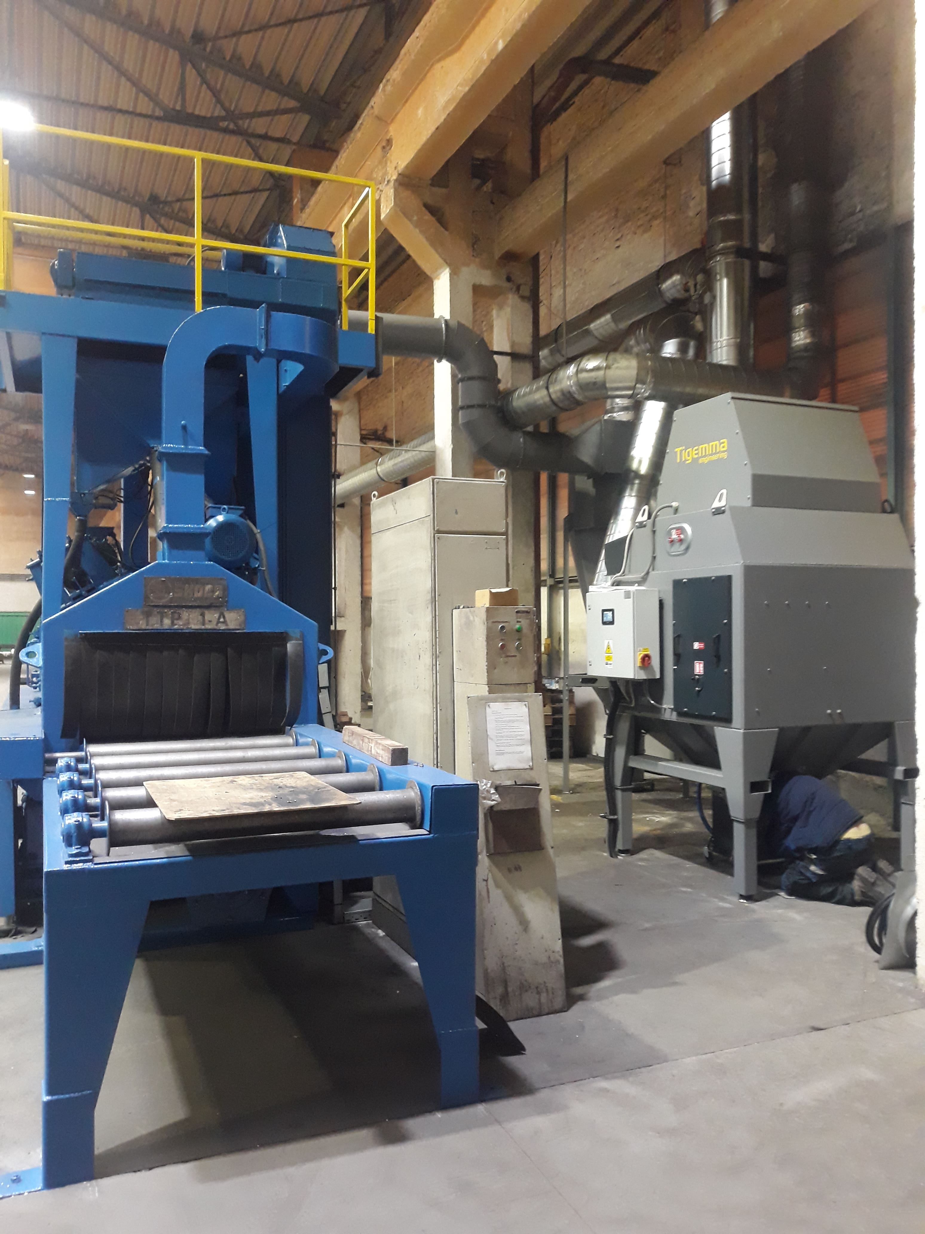 Instalace odsávacího zařízení na zrekonstruovaný průběžný tryskací stroj Škoda byla realizována v únoru 2019. Systém odsávání zahrnoval návrh filtrační jednotky TIG FS a cyklonový odlučovač TC 8400 o celkovém odsávaném objemu 7000 m3/h. Přefiltrovaná vzdušina z tryskacího zařízení je trvale vrácena v množství 25 % zpět do prostor výrobní haly. O přísun čistého vzduchu se stará primární vzduchotechnika nebo přirozené větrání objektu. Ovládání filtrační jednotky je řešeno soft startérem na základě binárního signálu z ovládacího rozvaděče tryskacího stroje Škoda.