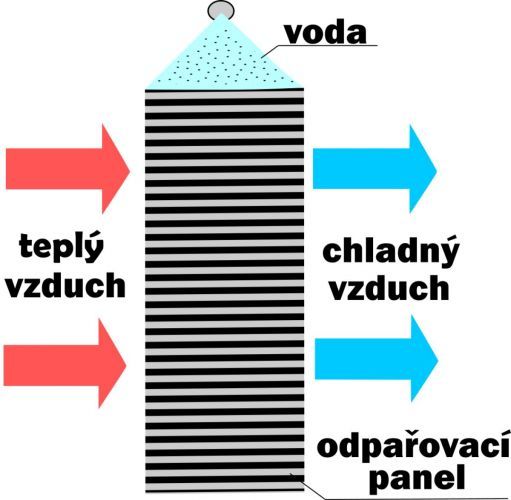 Adiabatické chlazení je proces, při kterém dochází k redukci tepla vlivem změny tlaku způsobené expanzí objemu vzduchu. Tento typ chlazení používá ke snížení teploty vzduchu cirkulaci vody, která stéká po odpařovacím panelu. Každá jednotka obsahuje ventilátor, který slouží k nucenému proudění vzduchu přes odpařovací panel a k dopravě vzduchu do vychlazovaných prostor. Při průtoku vzduchu přes odpařovací panel dochází k výměně tepla konvekcí mezi vodou a vzduchem. Výsledná teplota vzduchu závisí na velikosti proudu vzduchu a aktuální teplotě a vlhkosti venkovního vzduchu.