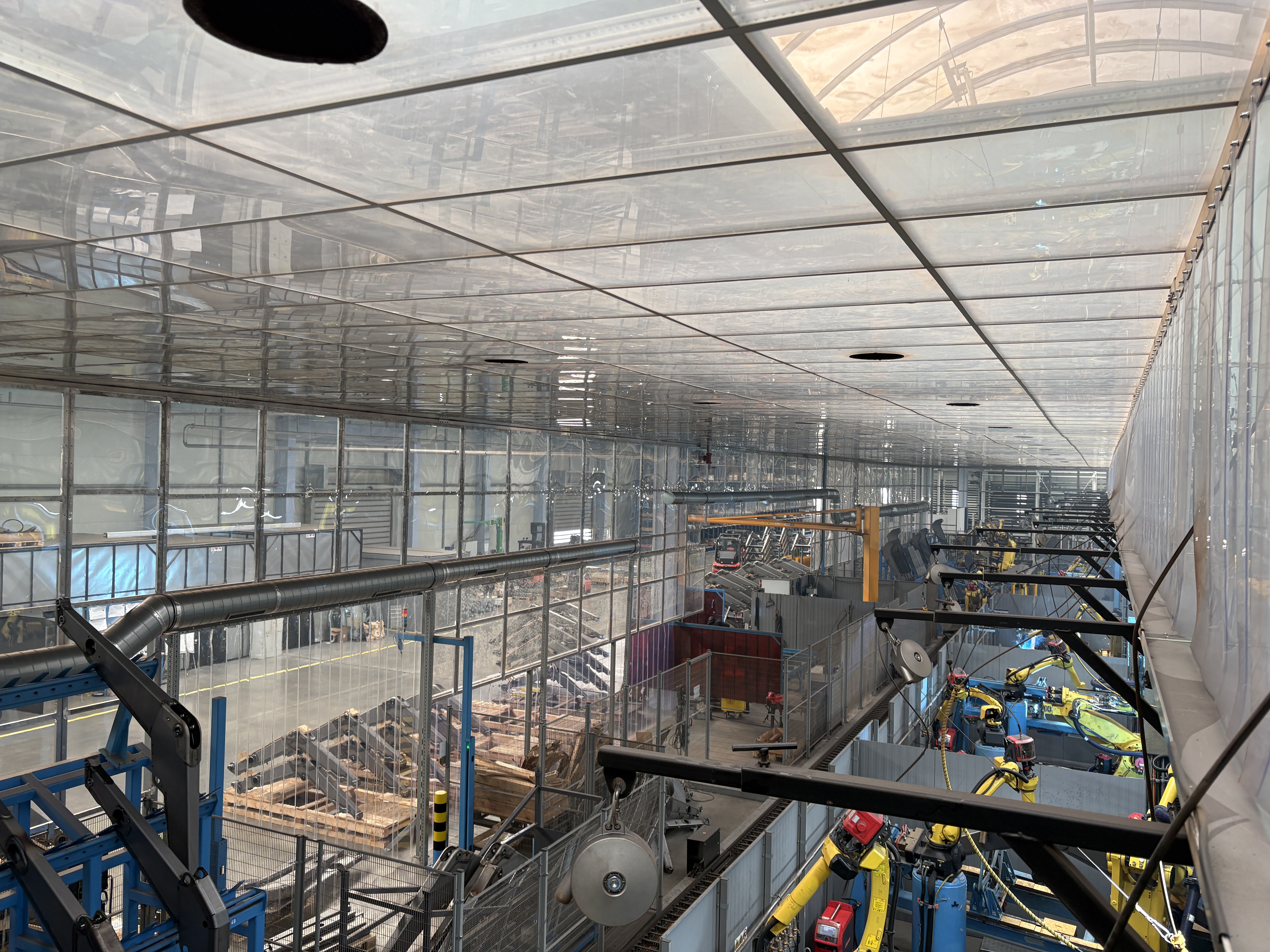The robotized welding line is located in an enclosed space with a volume of approximately 4,600 m³, which is separated from the surrounding hall by a covering structure. The basis of this installation is a lightweight aluminum structure combined with the AMF VENTATEC cassette ceiling system. The filling of the individual fields is made of transparent polycarbonate sheets, which allow sufficient light penetration and at the same time create a defined technological space with optimized air flow.