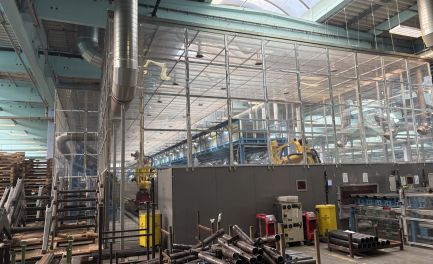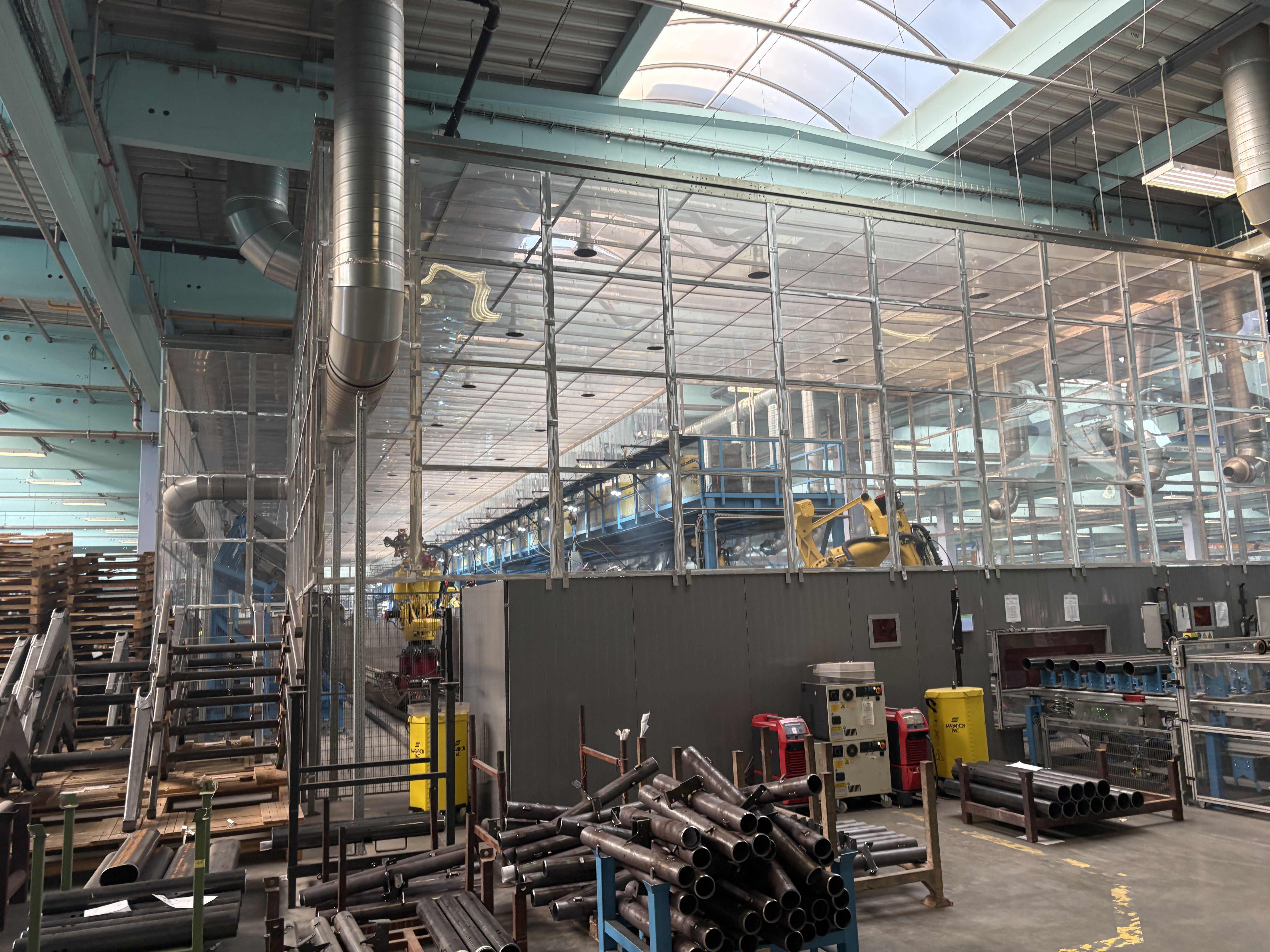 The extraction of welding fumes is ensured by a system of powerful fans and an air duct system terminated by suction diffusers located in the line area. Thanks to the concept of an enclosed space and controlled air flow, emissions are very effectively captured directly at their source, which allows the system to operate with optimized volumes of extracted air.