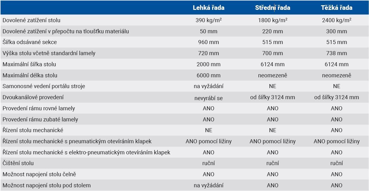 Maximální efektivita odsávání pro menší tloušťky materiálu. Nosnost stolu do 390 kg/m2.Tyto stoly se vyznačují nízkou hmotností a nižšími pořizovacími náklady. Jsou určeny především k dělení slabších materiálů do tloušťky 50 mm. Jednoduchá konstrukce a kvalita zaručuje dlouhodobou životnost tohoto zařízení. Ovládání klapek se děje pomocí pneumatického systému, a to ve dvojím provedení: s mechanicko-pneumatickým otevíráním klapek nebo s elektro-pneumatickým otevíráním klapek. Stoly jsou dodávány ve třech variantách odlišujících se typem lamel stolu. Stoly se vyrábějí v rozměrech pracovní šířky od 1000 do 2000 mm a délky 2000-6000 mm.