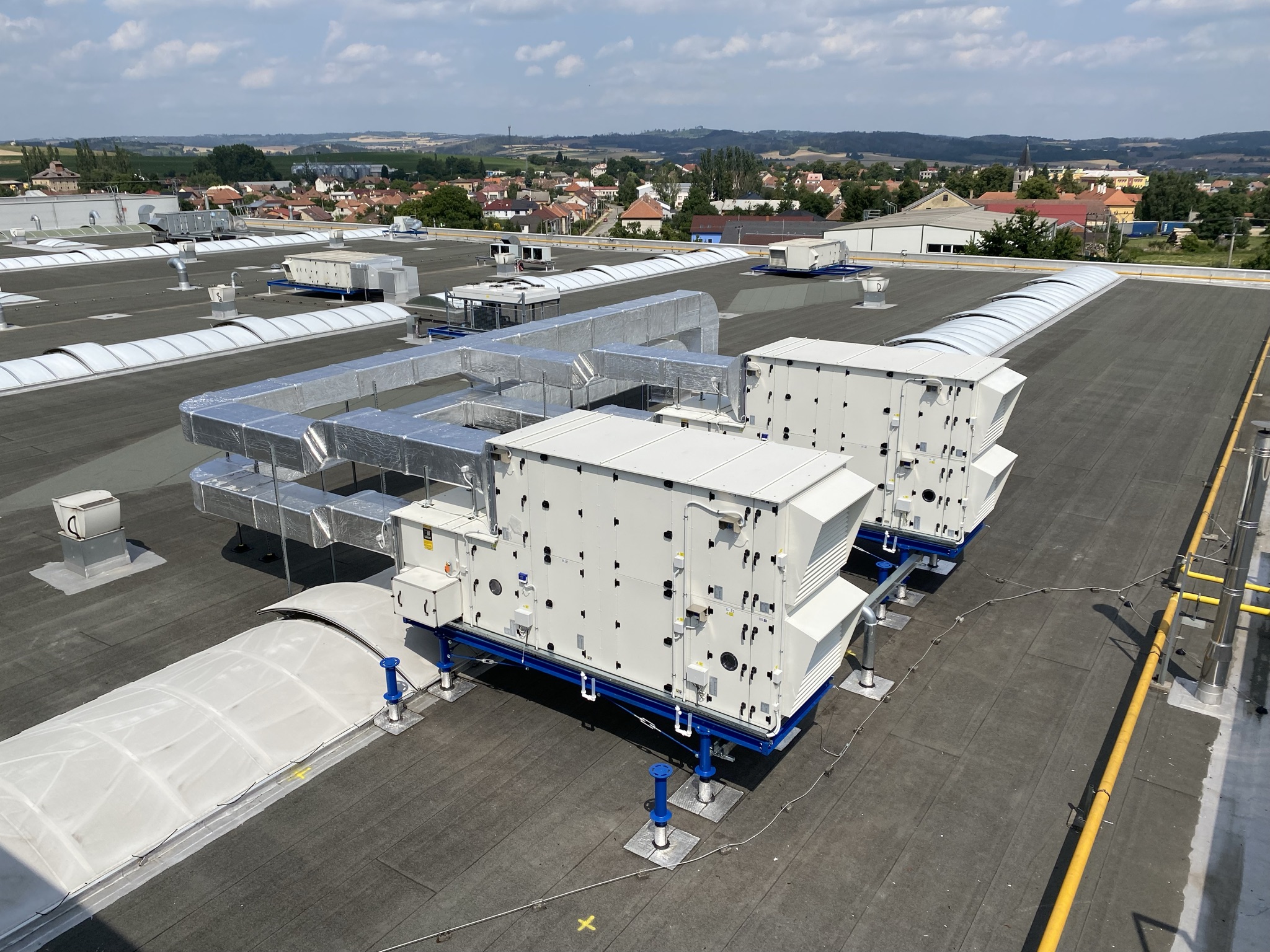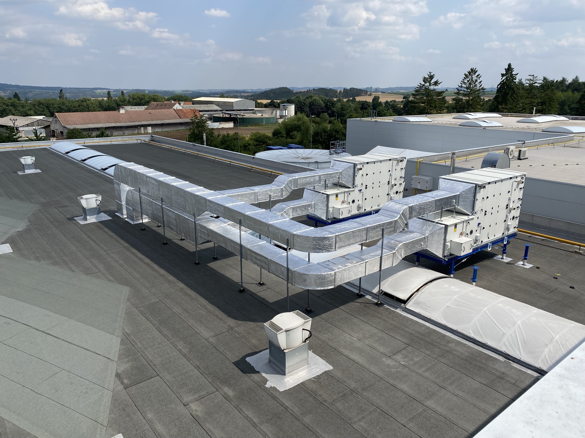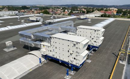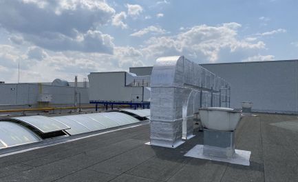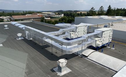 V roce 2021 jsme do společnosti dodali vzduchotechnický systém sloužící k větrání prostor tvářecích pecí výrobních linek. Celý systém nuceného větrání slouží k provětrání znečištěného vzduchu novým čerstvým přívodním vzduchem přímo na pracoviště navěšování a svěšování plastových dílů dopravníkového systému termo tvarovacích pecí. Pracoviště bylo v minulosti bez možnosti jakékoliv ventilace, z toho důvodu zde byl detekován velice často výskyt aerosolů a par vnikajících při procesu termotvarování plastových dílů. K nucenému větrání byly navrženy dvě vzduchotechnické jednotky s rekuperátorem Remak AeroMaster XP 28 o celkovém vzduchotechnickém výkonu 25 000 m3/h. Aby byl zajištěna stálá teplota vzduchu i v zimním období byly vzduchotechnické jednotky osazeny plynovým dohřevem vzduchu. Výměna vzduchu v prostorách linky byla navržená prostřednictvím vzduchotechnických rozvod obsahující sací elementy a prvky pro přívod vzduchu s důrazem na rovnoměrné rozprostření přiváděného vzduchu. Distribuce vzduchu do haly je řešena textilní vyústkou.