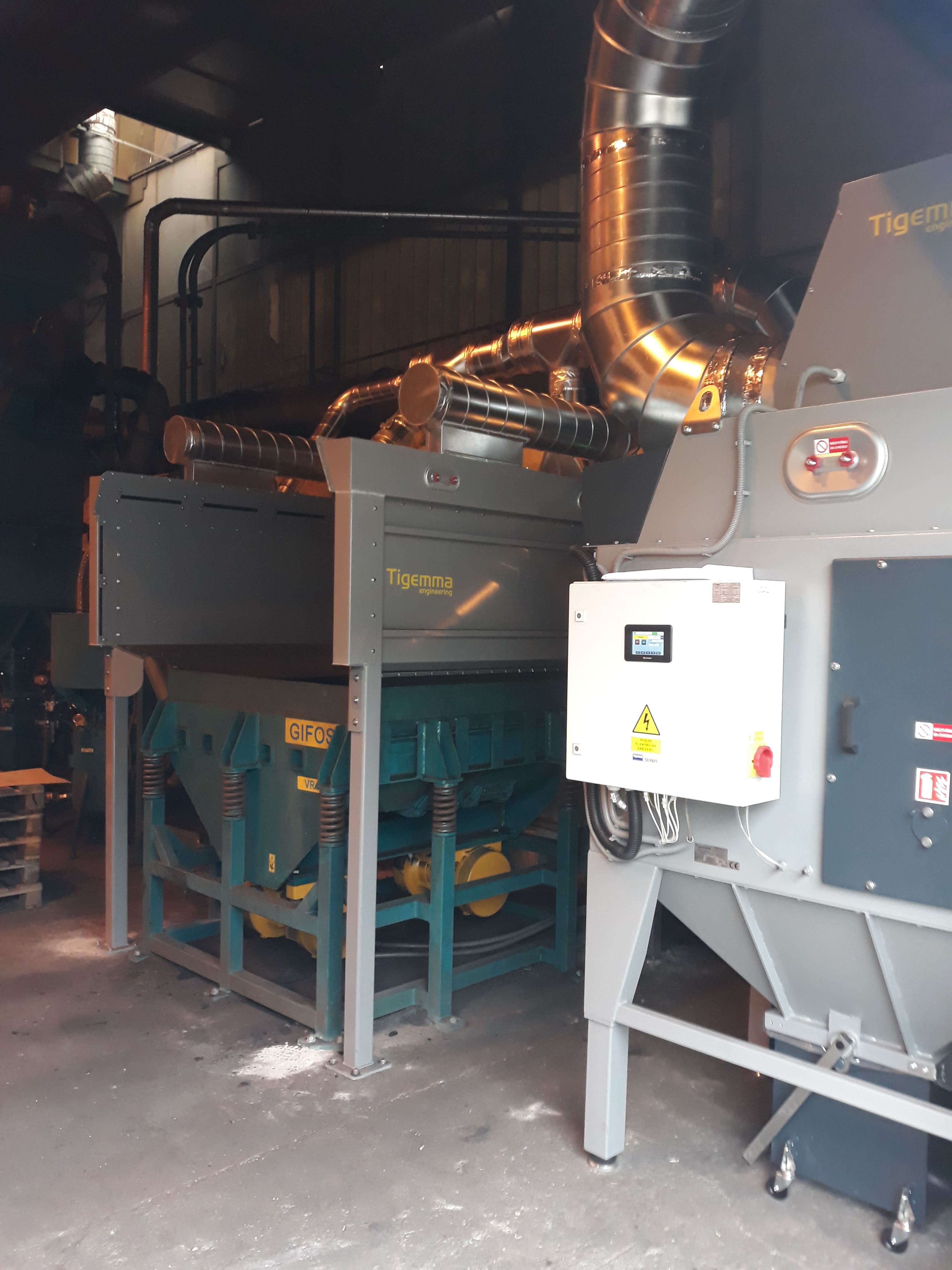 Základem celé aplikace je filtrační jednotka TIG FS, která je napojena pomoci VZT potrubí na jednotlivé odsávané stěny. Odsávané stěny jsou umístěny na samostatné konstrukci „U“ tvaru. Celkový odsávaný objem aplikace je 10 000 m3/h. Ovládání rozběhu filtrační jednotky je řešeno soft startérem na základě binárního signálu z rozvaděče vibračního stroje.